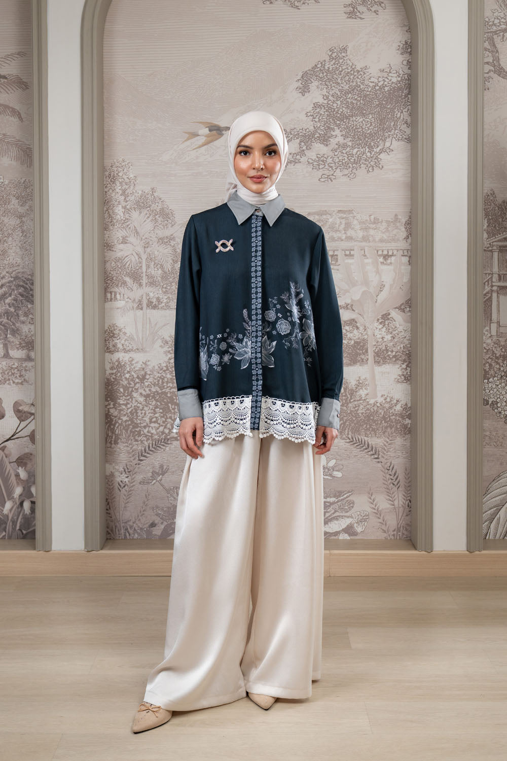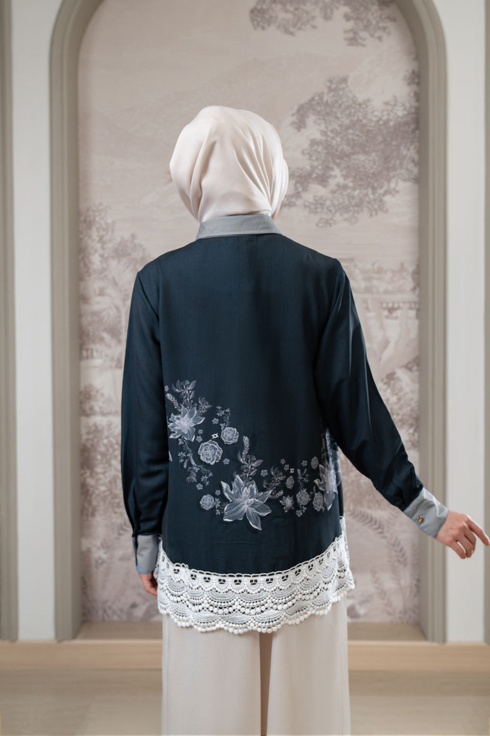 • Aksen lace katun di tepi bawah baju sebagai highlight elegan