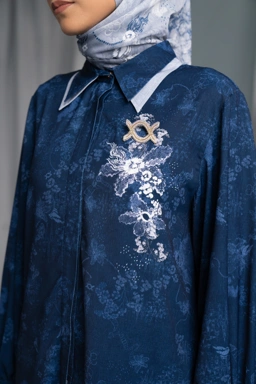 Bukaan hidden kancing bening dan snap gold klamby pada bagian kerah dan manset