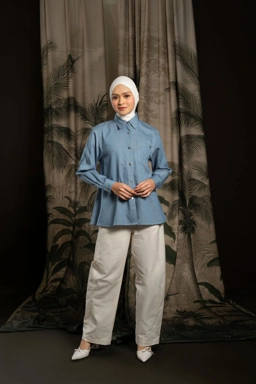 Shirt dengan volume A-line, menggunakan bahan denim look alike tidak berat dan adem