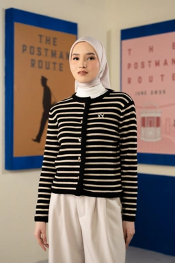 Cardigan dengan detail RIB solid color sebagai variasi pada bagian opening plaket, roundneck, hem, dan manset