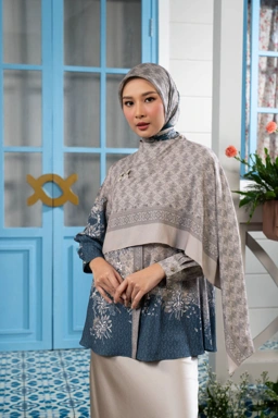 Terdapat variasi layer menyatu ke bagian sisi kanan, dikancingkan ke bagian bahu kiri